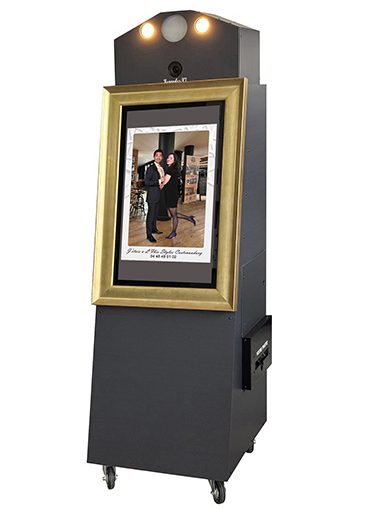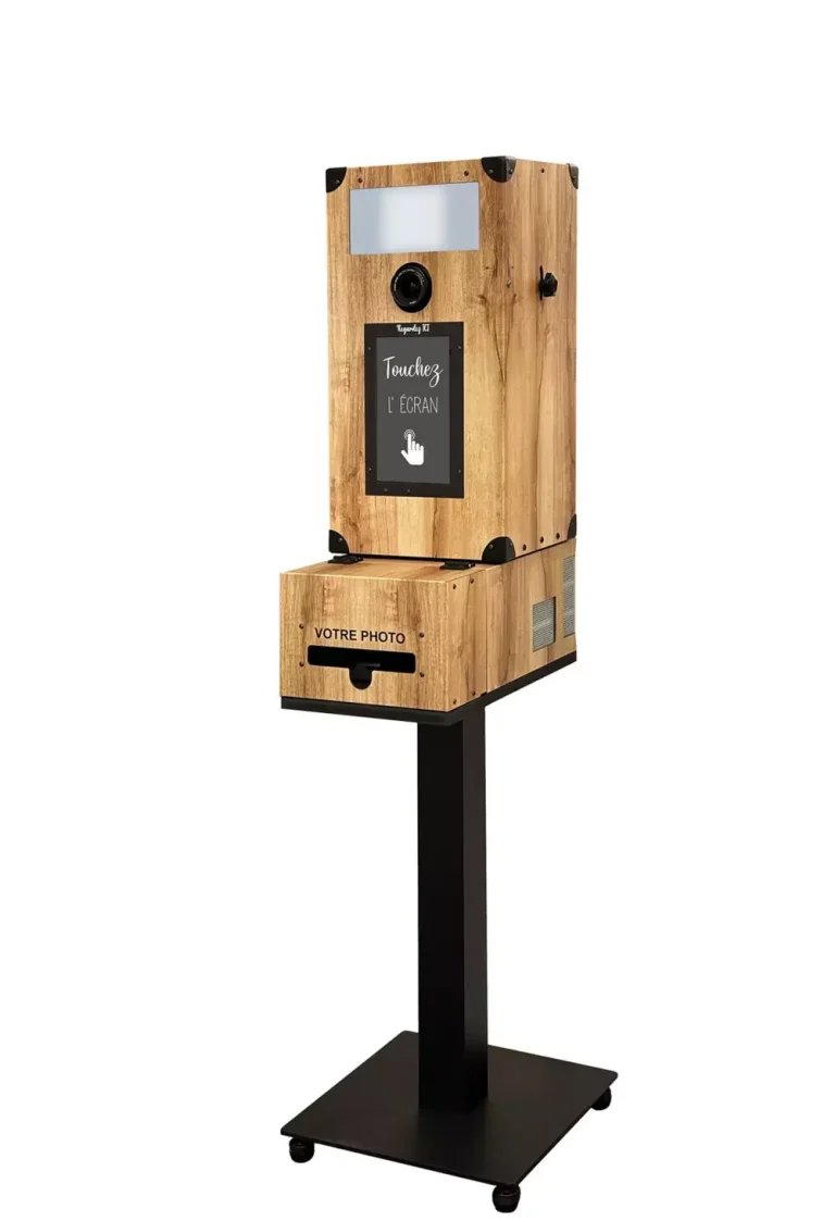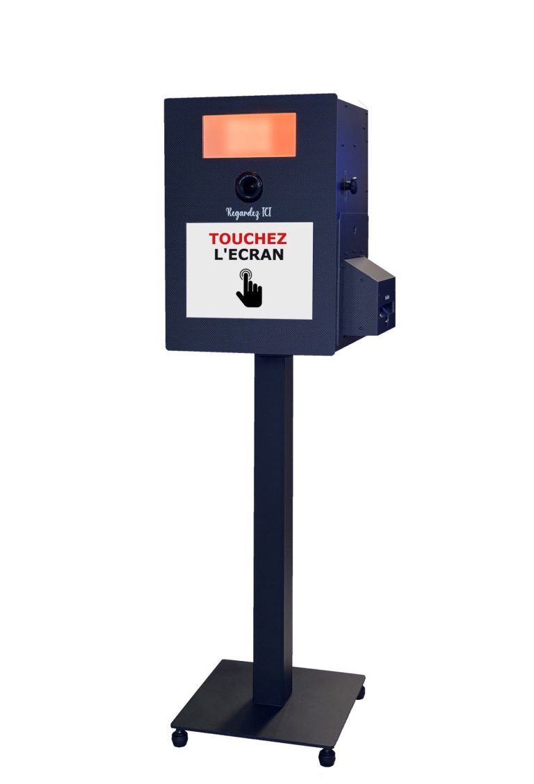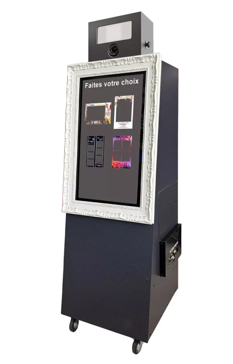 Grand écran tactile 15 Pouces. L47 x P35 x H60 - 32 kg - CANON 2000D avec FLASH - Éclairage d’ambiance led - Mini PC HP avec clavier et port USB - Imprimante DNP DS620 - Routeur 4G sans puce - Logiciels CIC V2 I.A. & Card Editor - Bac récupération photo - Platine appareil photo inclinable - Louée sur pied ou coffre à roulettes. Choix de plastron face avant (personnalisé + 79 € HT). Impression photo en 10 secondes.