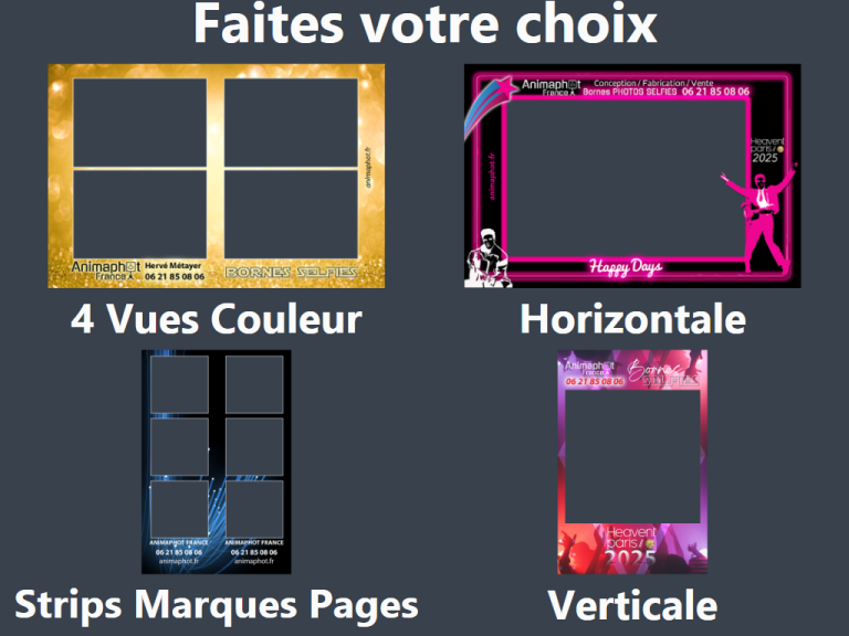 À contrario de beaucoup de bornes photos du marché qui utilisent des logiciels achetés sur internet sous forme d’abonnement annuel, ANIMAPHOT France développe en interne ses propres logiciels inclus dans le prix des bornes (sans abonnement de ce fait).